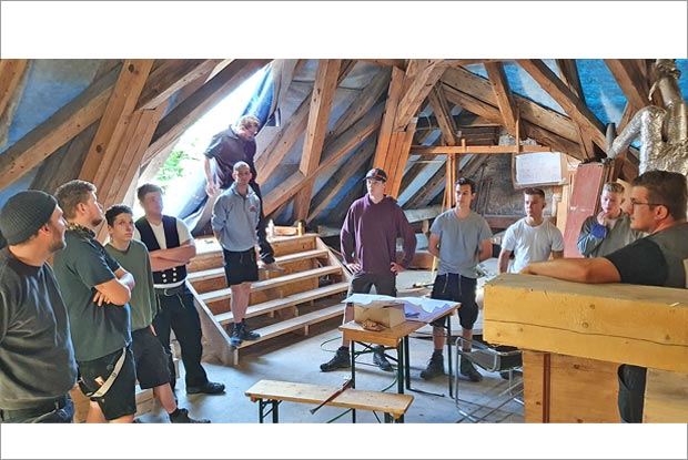 Machten einen Rundgang durch den dreistöckigen Walmdachstuhl: Die Auszubildenden wurden dabei vom erfahrenen Restaurator im Zimmererhandwerk Max Weber (r.) begleitet.