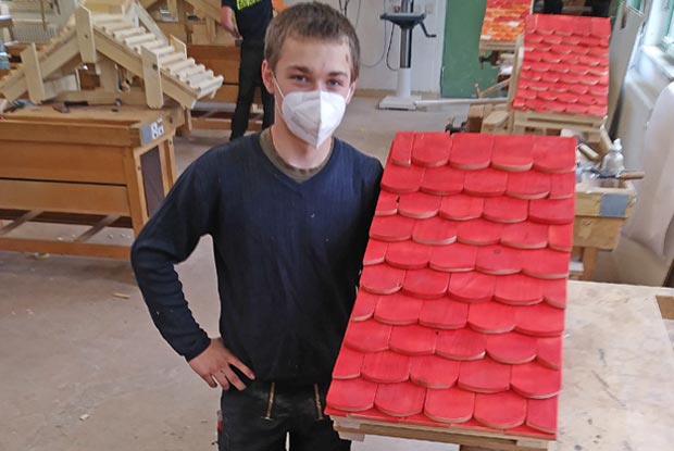 Außerdem haben die BGJ-Zimmerer an der Berufsschule Traunstein die verschiedenen Dachformen kennengelernt und diese in einem Miniaturmodell nachgebaut: Vom zweifachstehenden Pfettendachstuhl, über Sparren- und Pultdach bis zu steileren Dächern. Demnächst steht ein größeres Projekt an: „Im Team bauen wir eine kleine Holzhütte.“