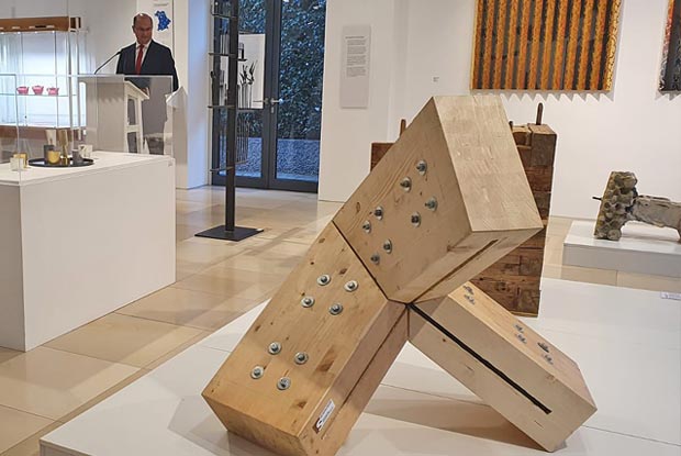 ÜBA-Ausbilder Wolfgang Weigl betreute die Azubis beim Bau und fädelte ein, dass die Holzverbindung aus dem modernen Ingenieurholzbau bei der Ausstellung gezeigt wird. Weigl erzählt von den Gegensätzen in der Galerie: „Auf der einen Seite wird eine über hundert Jahre alte, historische Blockwand eines Einfamilienhauses gezeigt. Sie symbolisiert eine klassische Eckverbindung im Zimmererhandwerk.“