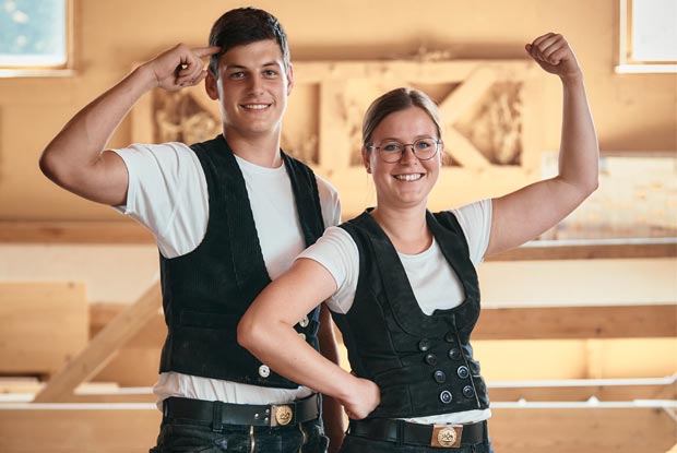Franzi Stanzel (25) ist Zimmermeisterin in der Zimmerei Einzinger in Aßling (Innung Ebersberg) und Uli Schwarzmann (19) arbeit als Zimmerer-Azubi im 2. Lehrjahr bei Holzbau Schlemmer in Jesenwang (Innung Dachau/Fürstenfeldbruck).